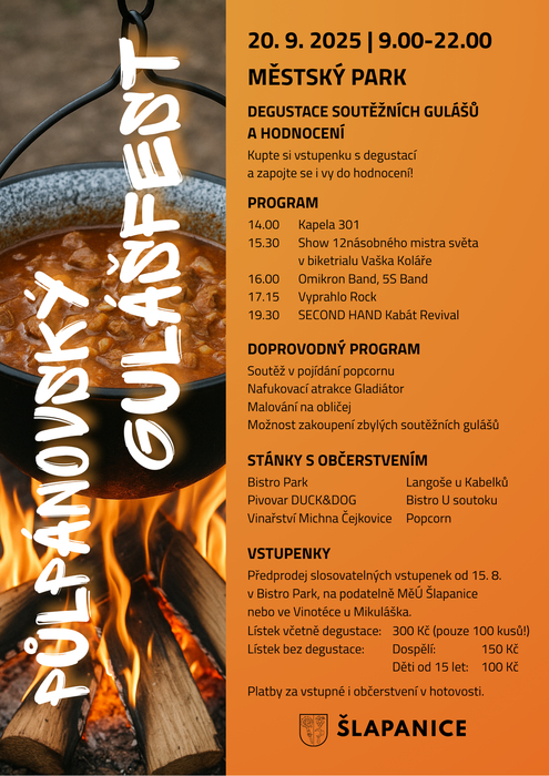Pojďte si vychutnat guláš přesně tak, jak ho máte rádi. Čtyři úžasné kapely, 12násobný mistr světa v biketrialu, soutěže, stánky s občerstvením a další doprovodný program. Předprodej slosovatelných vstupenek v Bistro Parku, na podatelně MěÚ Šlapanice nebo ve Vinotéce u Mikuláška. Těšíme se na vás!