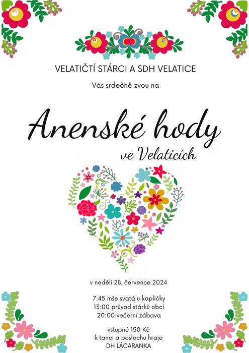 V neděli 28. července hned z rána bude v 7,45 poutní mše ke sv. Anně u kapličky na návsi. Ve 13,00 projde obcí průvod stárků a večer od 20,00 začne hodová zábava na nádvoří kulturního domu. K dobré náladě zahraje dechovka LÁCARANKA.