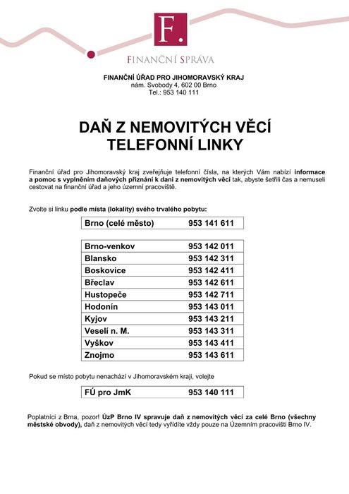 Úvod > Obec > Aktuality > Daň z nemovitých věcí - telefonní linky, výjezdy do obcí