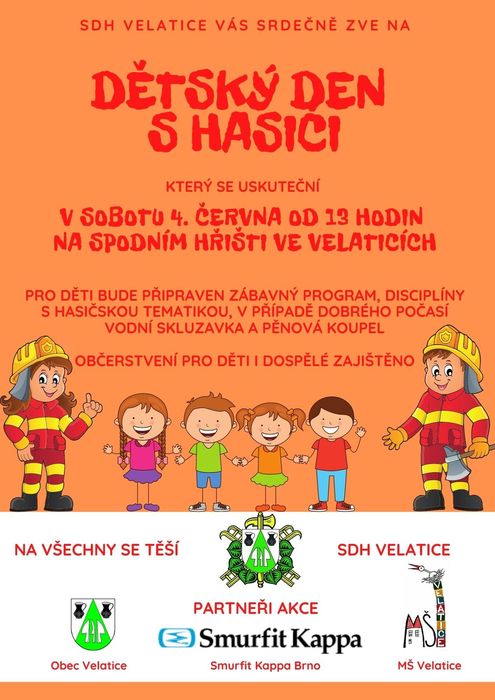 SDH Velatice vás srdečně zve na Dětský den s hasiči, který se uskuteční v sobotu 4. června od 13 hod na spodním hřišti. Bude připraven zábavný program, soutěže na téma Hasiči, vodní skluzavka a pěnová koupel. Občerstvení pro děti i dospělé bude zajištěno.