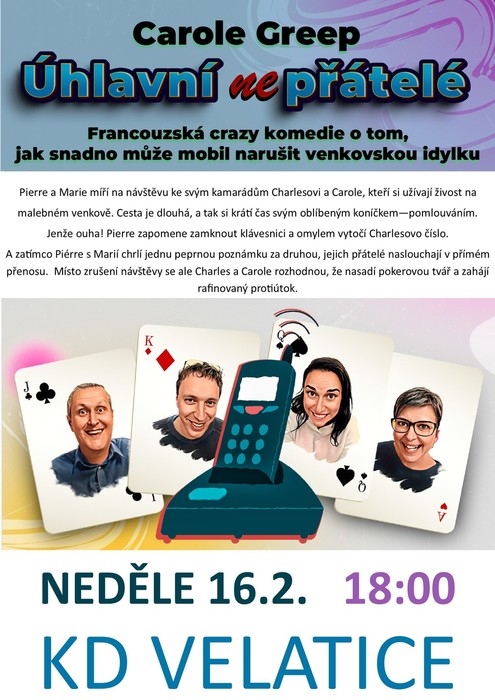Zveme vás na francouzskou crazy komedii v podání divadla AMADIS. ÚHLAVNÍ (ne) PŘÁTELÉ, je příběh o tom, jak snadno může mobil narušit venkovskou idylku. Neděle 16.2. v 18,00 KD Velatice Vstupné dobrovolné!
