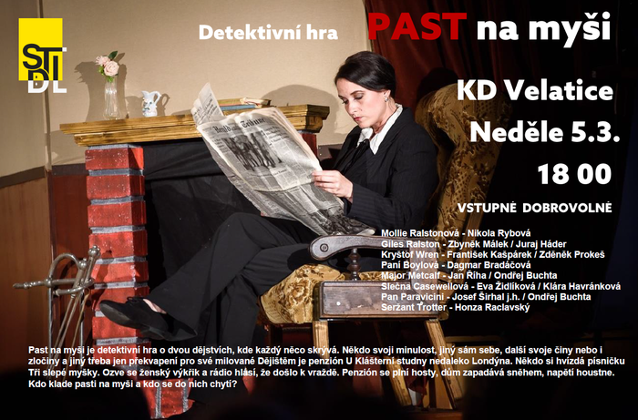 Na programu bude detektivní drama Past na myši od divadelního spolku Stodola. Hra o dvou dějstvích, kde každý něco skrývá. Někdo svoji minulost, jiný sám sebe, další svoje činy nebo i zločiny a jiný třeba jen překvapení pro své milované Dějištěm je penzión U Klášterní studny nedaleko Londýna. Někdo si hvízdá písničku Tři slepé myšky. Ozve se ženský výkřik a rádio hlásí, že došlo k vraždě. Penzión se plní hosty, dům zapadává sněhem, napětí houstne. Kdo klade pasti na myši a kdo se do nich chytí? https://divadlostodola.cz/hra/past-na-mysi