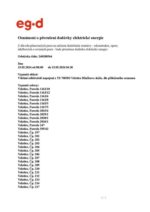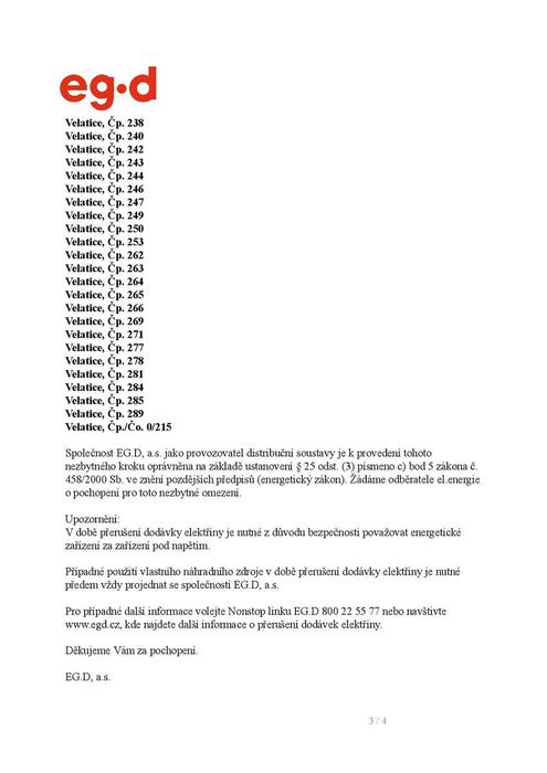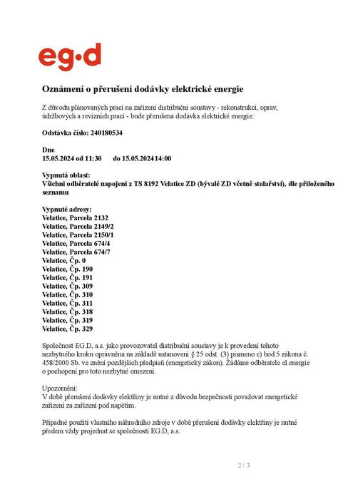 EG.D - Oznámení o přerušení dodávky elektrické energie - 15. 5.