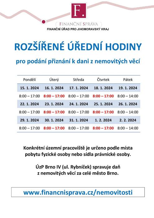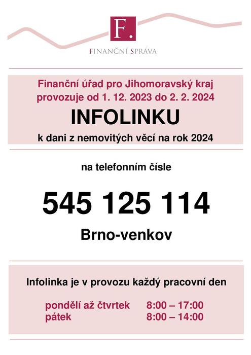 Úvod > Obec > Aktuality > FÚ - kontakt na infolinku k dani z nemovitých věcí na rok 2024, úřední hodiny