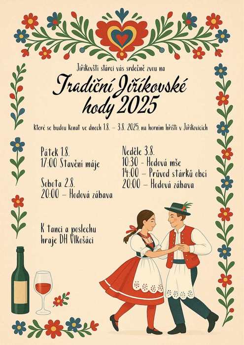 Jiříkovští stárci Vás zvou na tradiční Jiříkovské hody, které se budou konat v sobotu 2.8. a v neděli 3.8. V sobotu ve 20 hodin začíná hodová zábava. V neděli proběhne v 10:30 mše svatá, ve 14 hodin průvod stárků obcí a ve 20 hodin hodová zábava. K tanci a poslechu hraje DH VLKOŠÁCI. Hody budou za příznivého počasí probíhat na horním hřišti v Jiříkovicích.