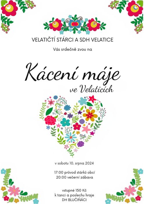 Velatičtí stárci a hasiči vás zvou na Kácení máje. V sobotu 10. srpna na dvoře kádéčka. Od 17 průvod stárků. Ve 20 zábava. K tanci hraje dechovka Blučiňáci. Přijďte si skočit, bude o trochu víc místa a o půlnoci překvápko :-)