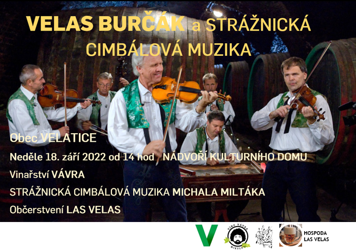 Obec Velatice zve všechny na setkání u burčáku. V neděli 18.9. od 14 hod na nádvoří KD. K poslechu zahraje strážnická cimbálová muzika Michala Miltáka. Všichni jste srdečně zváni.