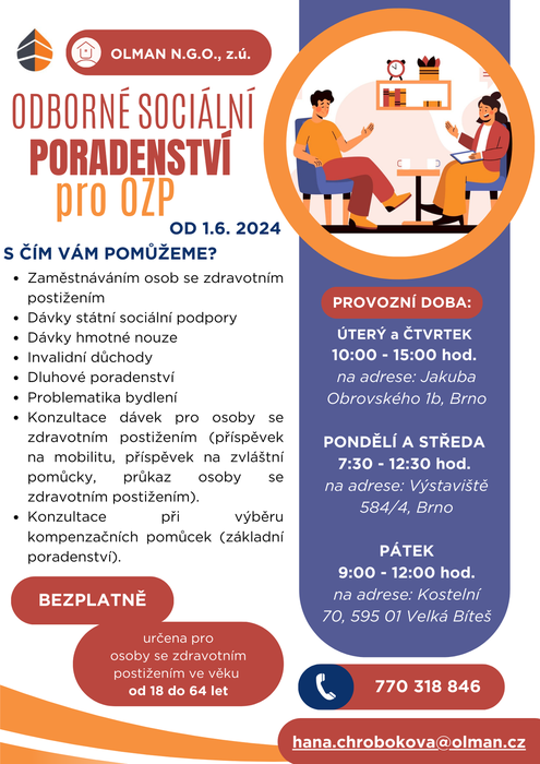 - Konzultace dávek pro osoby se zdravotním postižením (příspěvek na mobilitu, příspěvek na zvláštní pomůcky, průkaz osoby se zdravotním postižením).