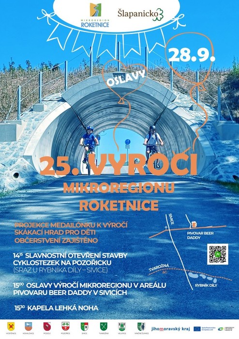 Zástupci mikroregionu vás všechny srdečně zvou na oslavy 25. výročí Mikroregionu Roketnice, jejichž součástí bude i slavnostní předání stavby II. etapy cyklostezek na Pozořicku. Otveřen bude o úsek z Tvarožné do Kovalovic.