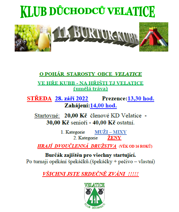 Klub velatických důchodců zve všechny na čerstvý vzduch. Můžete si zasoutěžit ve hře KUBB, ochutnat burčák, opéct cokoliv na ohni a vůbec se dobře pobavit. Neváhejte a přijďte 28. září na spodní hřiště. Prezentace bude od 13:30. Více na přiložené pozvánce. Všichni jste srdečně zvaní!
