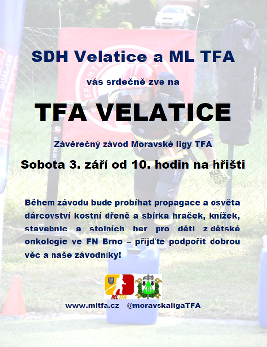 Hasiči Velatice a Moravská liga TFA pořádají 3. září poslední závod letošního seriálu. Přijďte povzbudit naše závodníky a současně podpořit dobrou věc ve prospěch dětské onkologie FN Brno. Od 10 hod na spodním hřišti.
