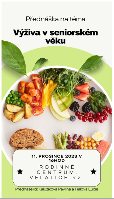 Zveme všechny, nejen seniory na přednášku na téma Výživa v seniorském věku. Probereme zásady zdravé výživy s důrazem na potřeby a rizika v pokročilém věku z pohledu nutričního terapeuta. Lehce se dotkneme i léčebné výživy, proto neváhejte se k nám přidat v pondělí 11. 12. v 16,00 Rodinné centrum na Obecním úřadě.