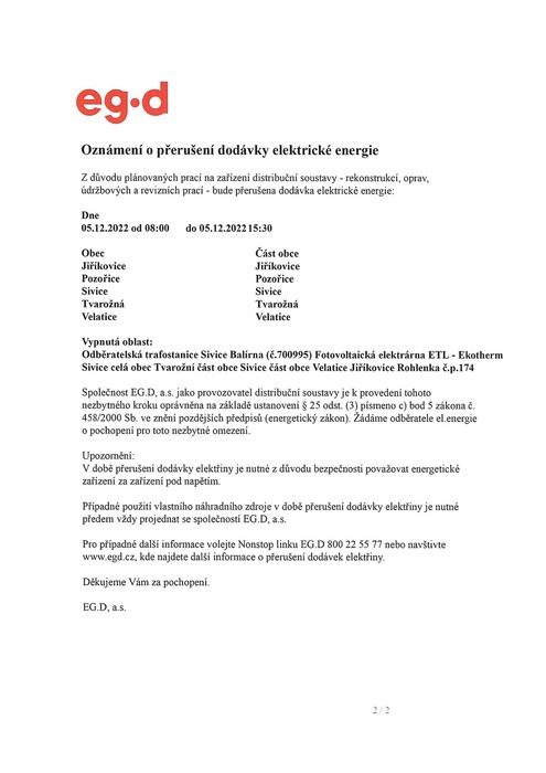 Úvod > Obec > Aktuality > Přerušení dodávky elektrické energie - 5. 12. - Dolní Podškolí, Zahrádky, Zaosadí, Betlém