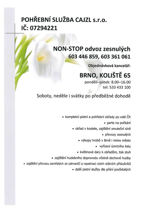 Firma je kromě výkopových prací schopna zajistit i kompletní pohřební obřad. Bližší informace v přiloženém letáku.