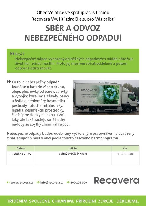 Obec Velatice ve spolupráci s firmou Recovera Využití zdrojů a.s. zajistí dne 3. dubna od 15.30 do 16.00 hodin ve sběrném dvoře Za Mlýnem