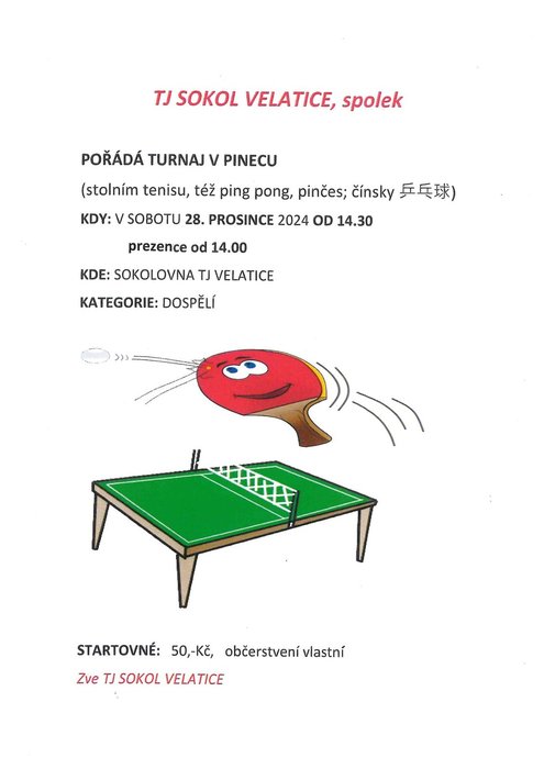 TJ Sokol Velatice pořádá turnaj ve stolním tenisu pro dospělé v sobotu 28. prosince od 14.30 hodin v sokolovně ve Velaticích. Prezence na sokolovně od 14.00 hodin, začátek turnaje od 14.30 hodin. Startovné 50,- korun.