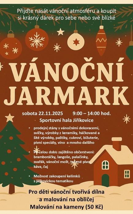 Obec Jiříkovice pořádá v sobotu 22.11.2025 již 3. ročník vánočního jarmarku, na který vás srdečně zveme. Jarmark se koná od 9:00 do 14:00 hodin ve sportovní hale.