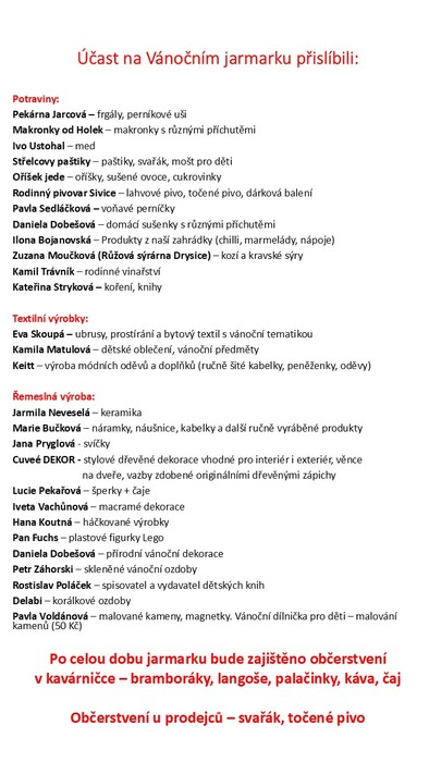 Účast přislíbilo velké množství prodejců. Můžete si zakoupit paštiky, frgály, sušené ovoce, sýry, svíčky, skleněné vánoční ozdoby, vánoční dekorace a mnoho dalšího. Zajištěno bude i občerstvení - bramboráky, langoše, palačinky, točené pivo, svařené víno.