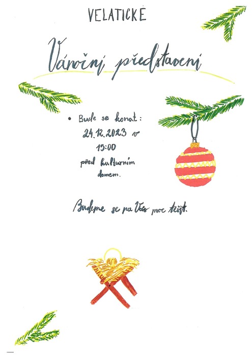 Velatické dětipod vedením Marie Severové vás všechny srdečně zvou na tradiční vánoční představení, které bude na Štědrý den 24.12. v 15,00před kulturním domem. Pojďme popřát sousedům hezké Vánoce, všichni jste vítáni.